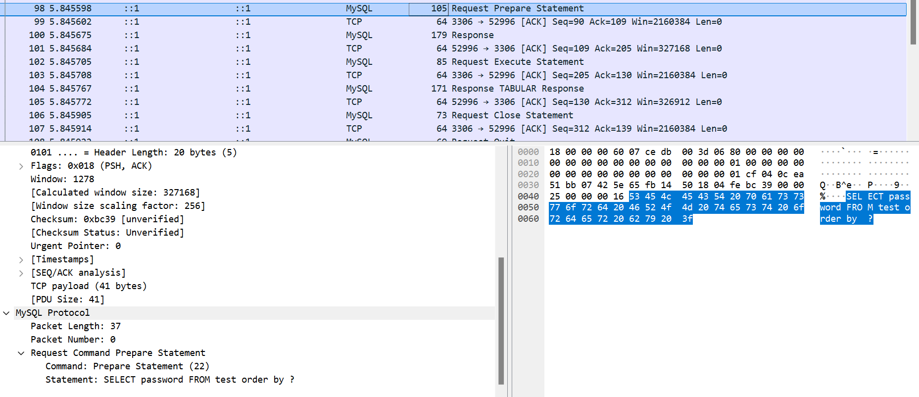 那么预编译消除了哪个过程可能的sql注入呢?其实是客户端到web服务这一层的,因为他消除了语句的歧义,让web服务发送给数据库服务的sql语句就是真实想查询的sql语句,但预编译消除了web服务到数据库服务这个过程的sql注入了吗?如果我的注入并不能通过消除歧义解决,那么预编译还有作用吗?现在我们将目光转向web服务和数据库服务的通讯方式——二进制协议,来探讨一下从web服务到数据库服务这个过程的sql注入。