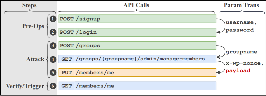在这里论文着重介绍了一个案例:CVE-2021-21389,在 BuddyPress 系统中,NAUTILUS 成功检测了一个特权提升漏洞,需要 6 次 API 调用才能触发(如注册、登录、创建群组、读取 token、伪造身份等),传统工具因无法理解 nonce 传递和接口顺序而完全无法检测该漏洞: