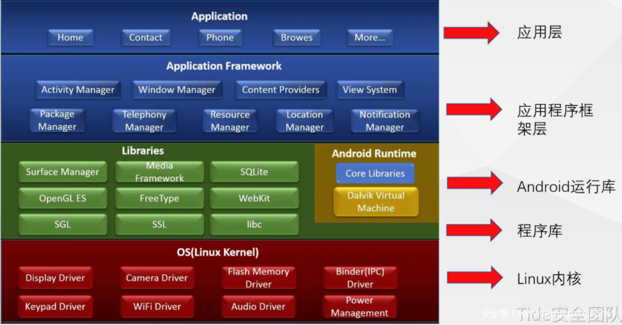 Llnux内核层: Android 的 Linux 内核层是整个系统的基础,负责管理底层硬件资源和系统服务,包括进程管理、内存管理、电源管理、网络通信和文件系统等,同时还集成了 Android 特有的模块如 Binder(用于进程间通信)、Ashmem(匿名共享内存)和 Wakelocks(电源控制),为上层应用提供一个稳定、高效且安全的运行环境。