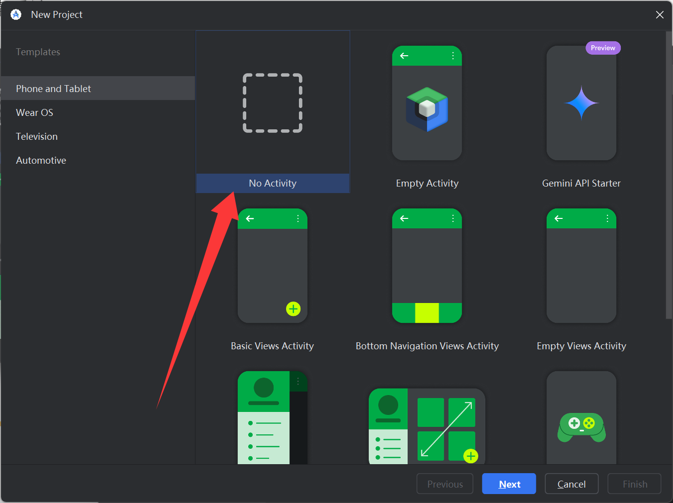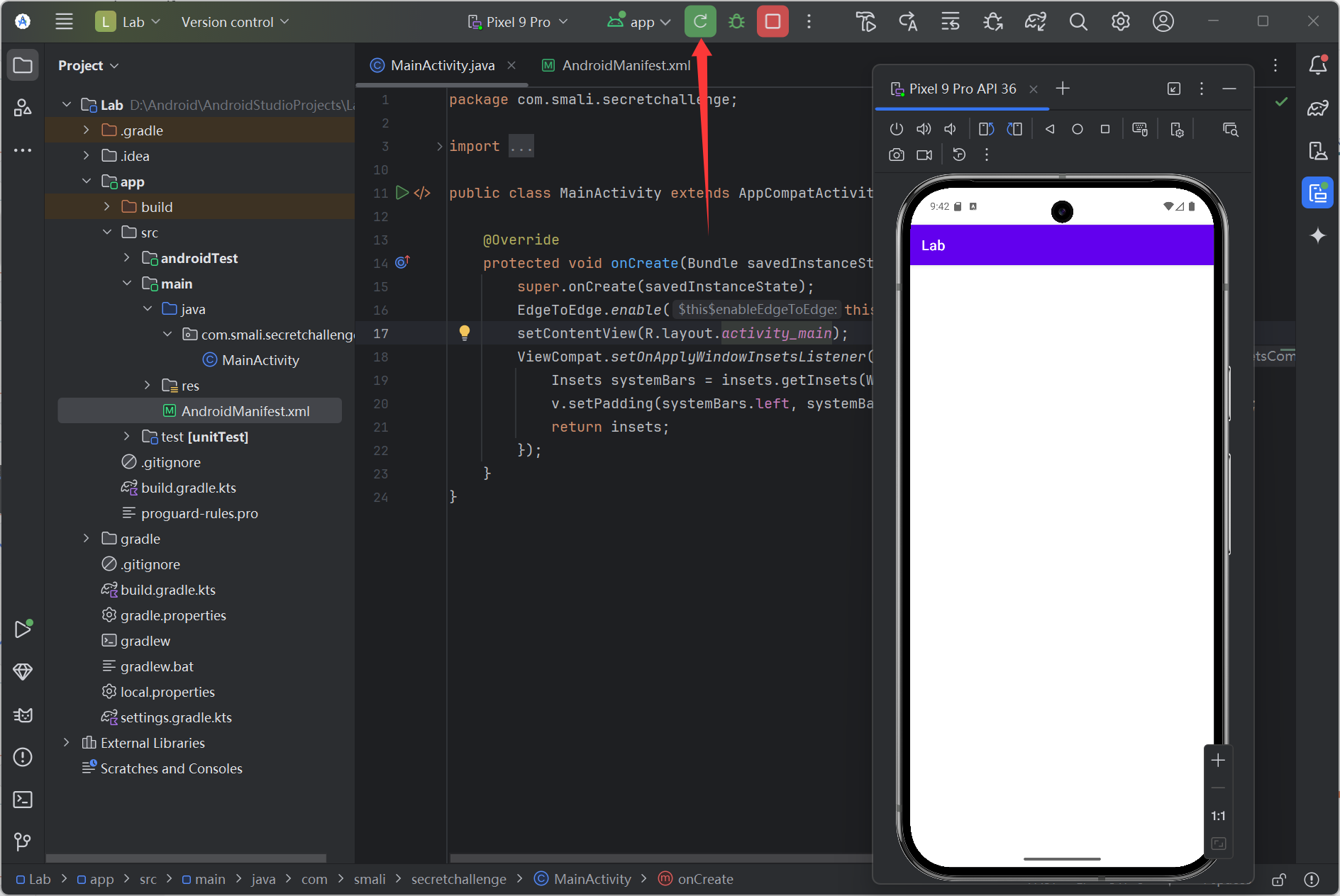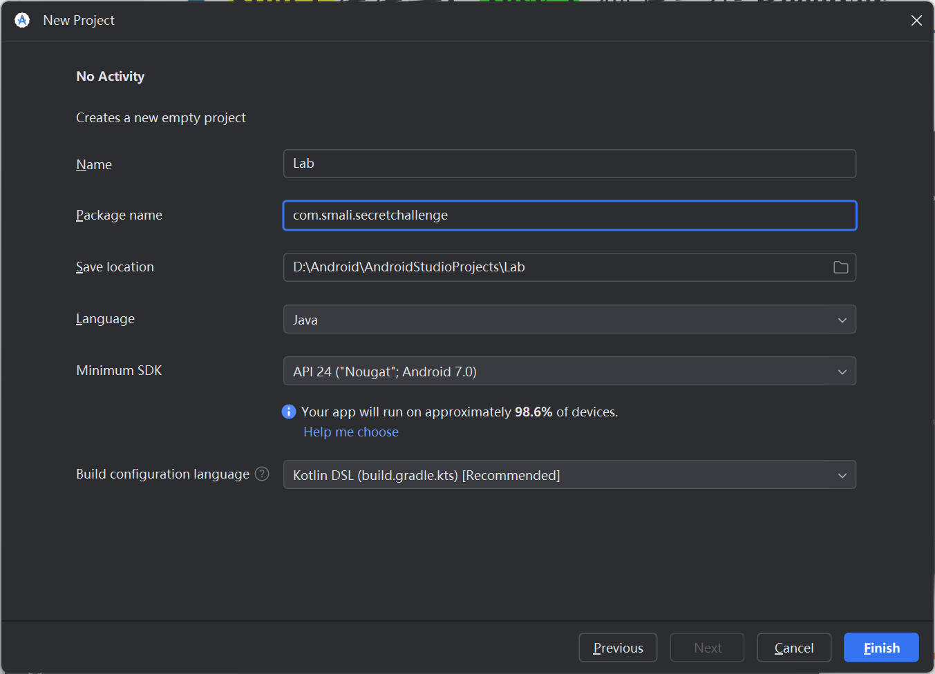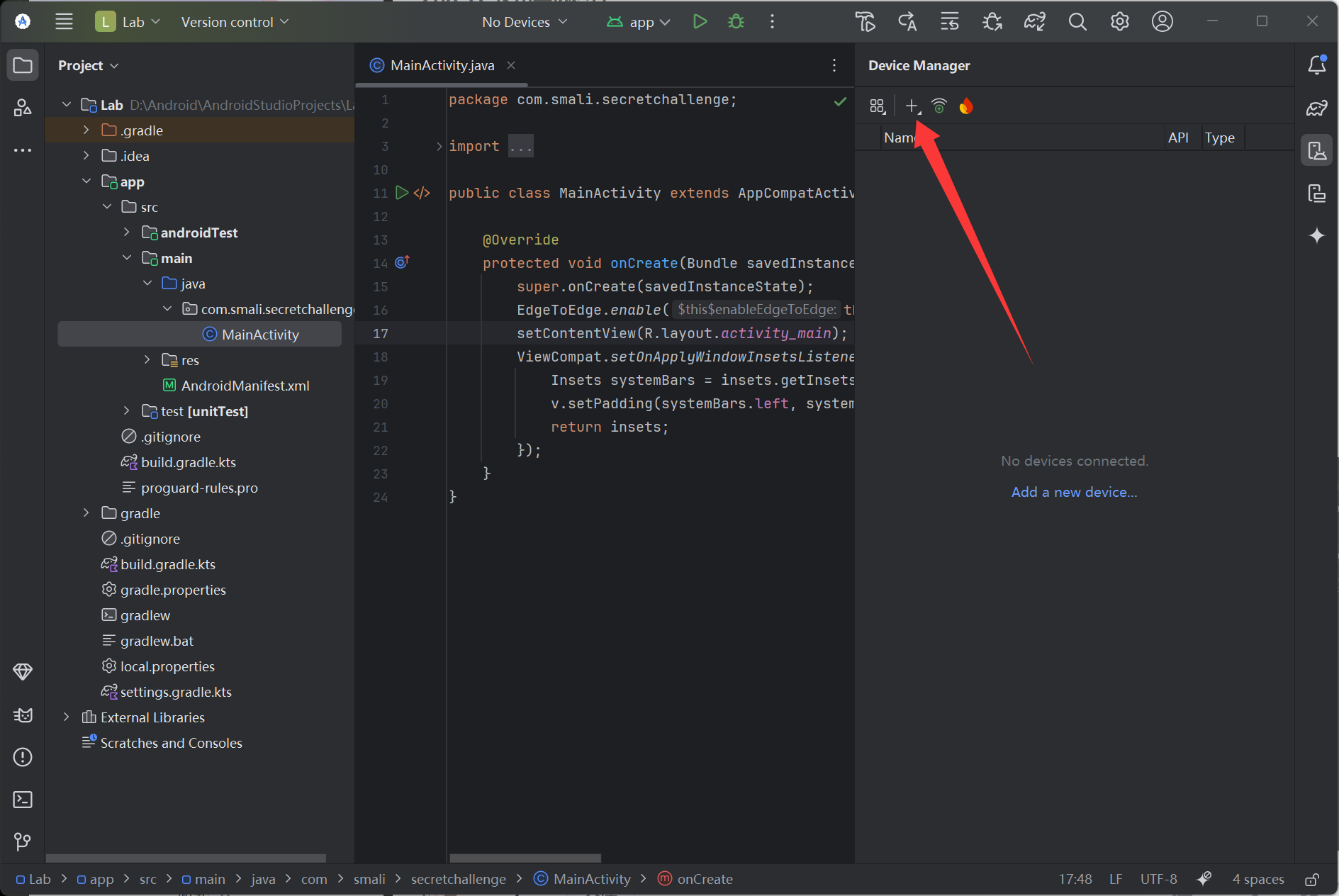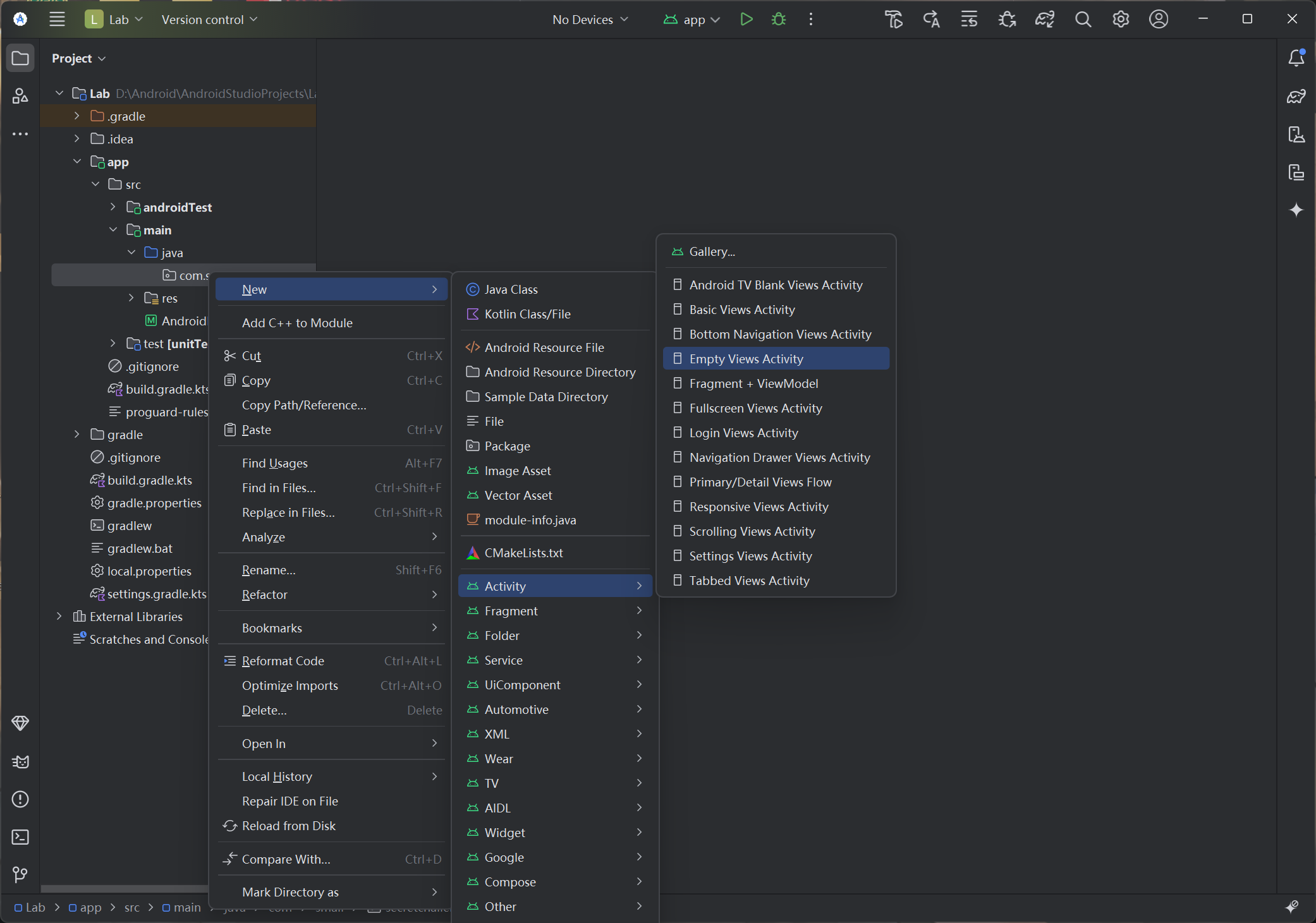创建好之后可能会因为Importing ‘Lab’ Gradle Project卡一会儿,然后创建一个activity: