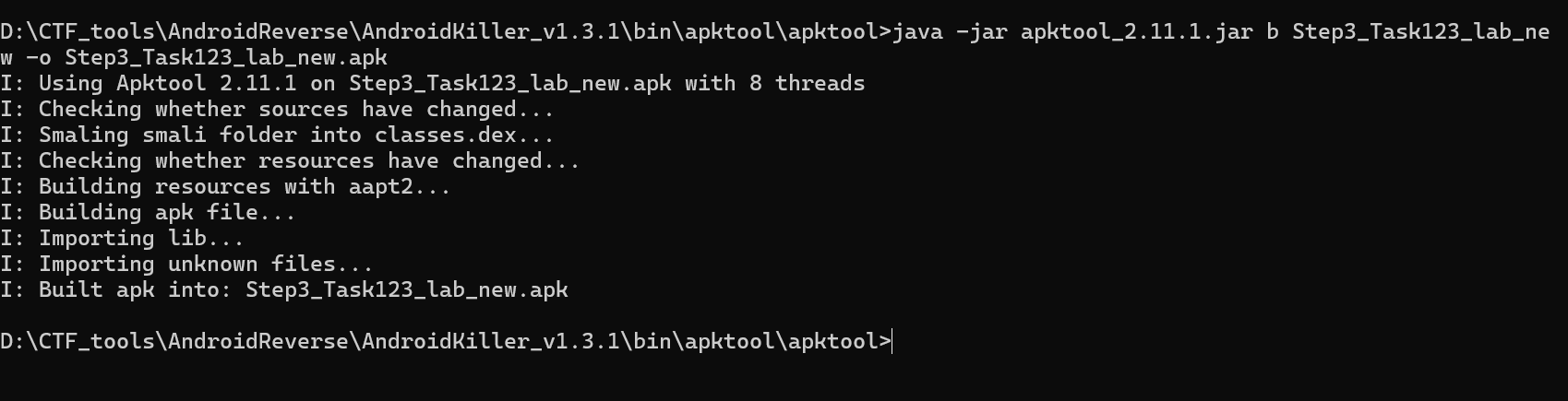 java -jar apktool_2.11.1.jar b Step3_Task123_lab_new -o Step3_Task123_lab_new.apk