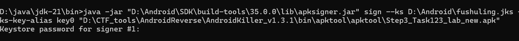 java -jar "D:\Android\SDK\build-tools\35.0.0\lib\apksigner.jar" sign --ks D:\Android\fushuling.jks --ks-key-alias key0 "D:\CTF_tools\AndroidReverse\AndroidKiller_v1.3.1\bin\apktool\apktool\Step3_Task123_lab_new.apk"