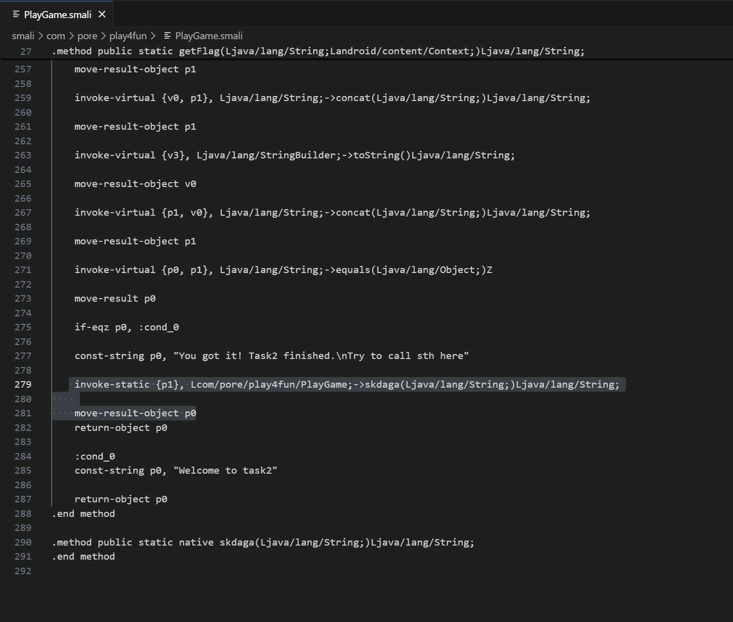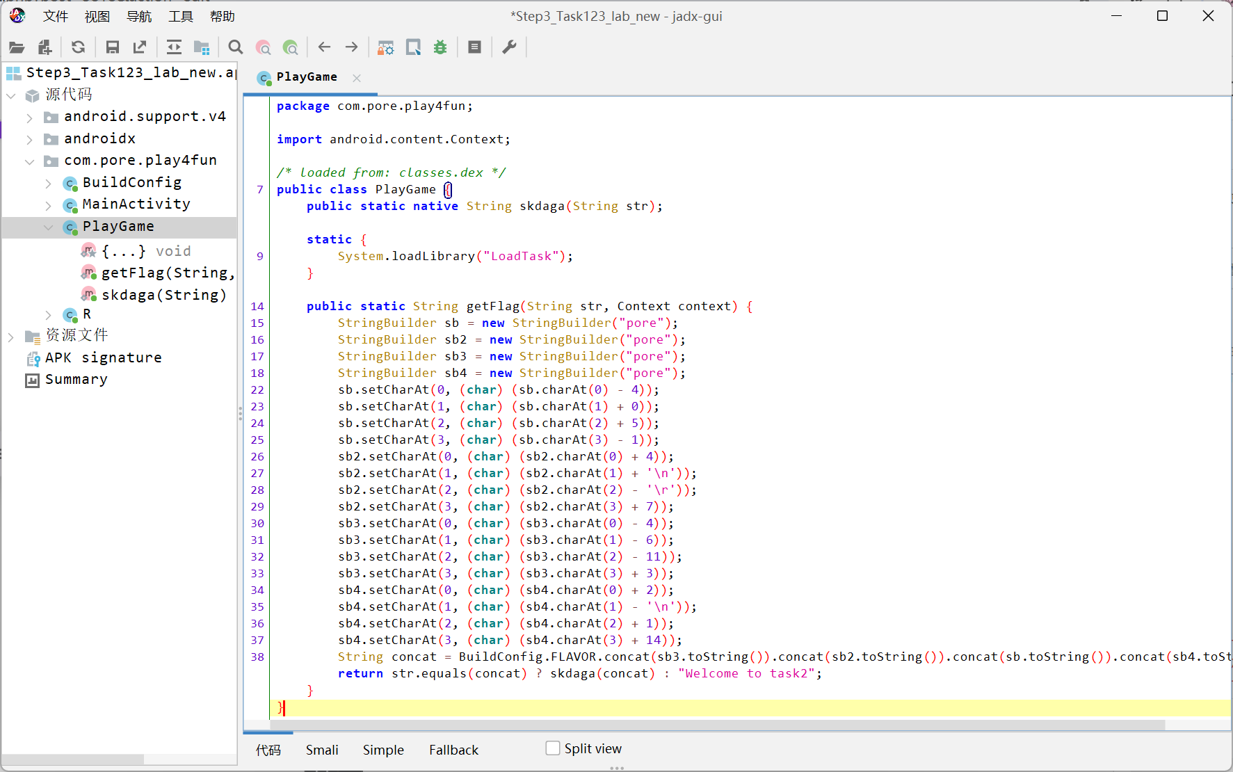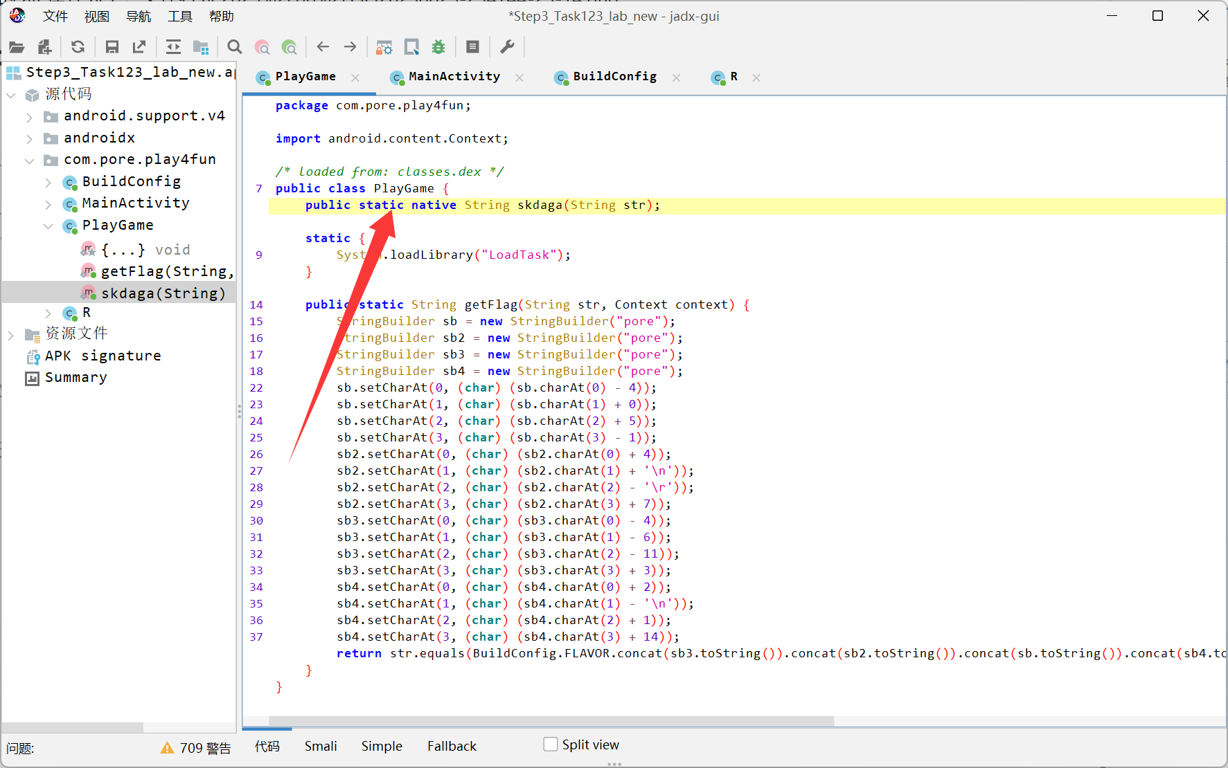 提示让我们调用某个东西,那可能是 native 函数、隐藏的方法、某个 JNI 接口或隐藏的逻辑,回看这里可以看到有个native方法,那就是得手动调用这个东西,传入的参数必须是这BuildConfig.FLAVOR.concat(sb3.toString()).concat(sb2.toString()).concat(sb.toString()).concat(sb4.toString())