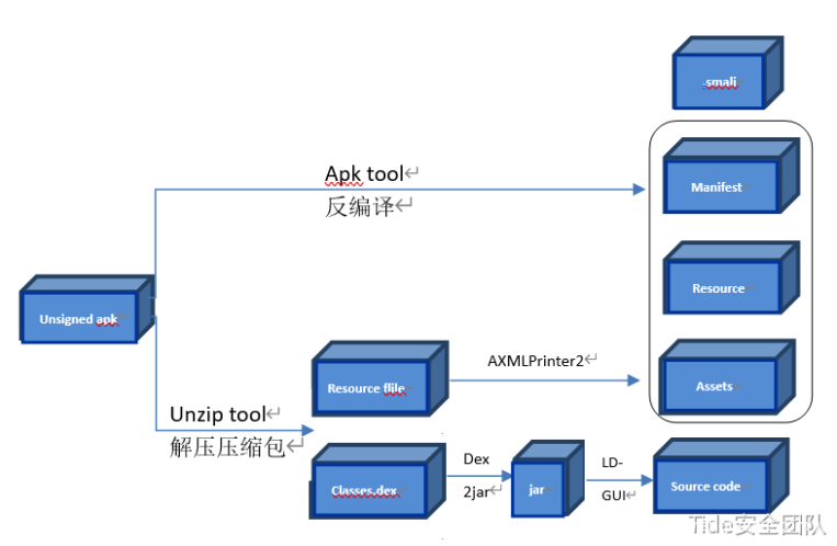Android应用反编译流程很显然,就是app生成过程的逆过程,对于最左边的目标——未签名apk,有两条反编译路线: