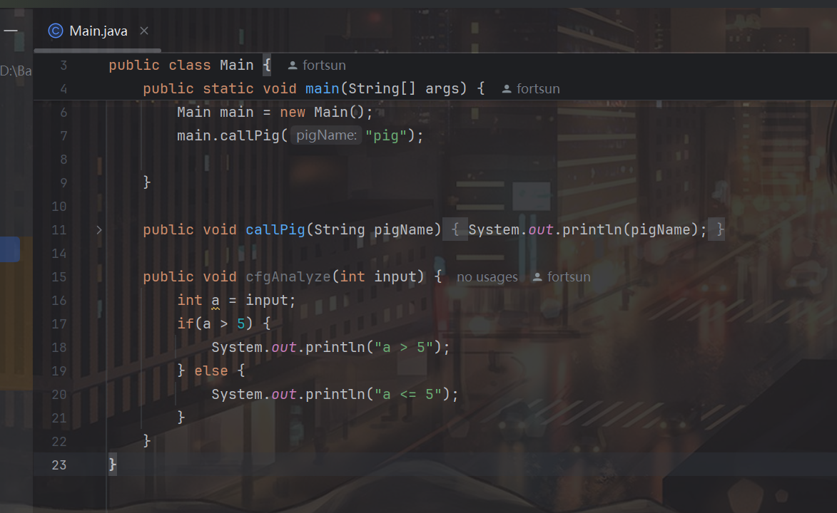 这里输出的方法是soot特有的method signature,包含方法名、参数等信息,<init>指的是java类默认的构造方法。这里我们将生成的method signature和代码里真实的main方法做一个对比,可以看到还是蛮形象的:
