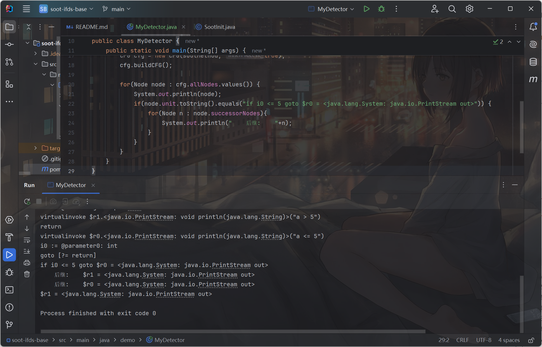 上面的输出是乱序的Jimple IR,但我们可以从node的属性中获取前后驱关系,比如 node.successorNodes,把上面的遍历改成下面这个: