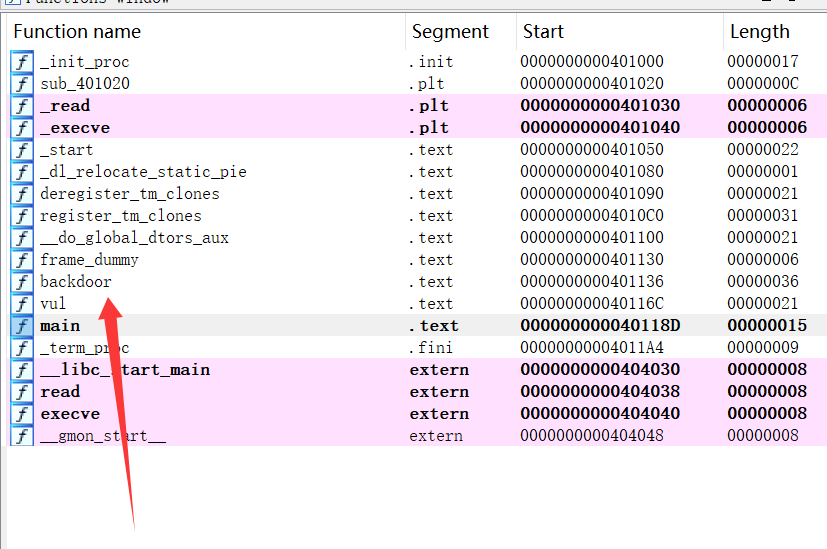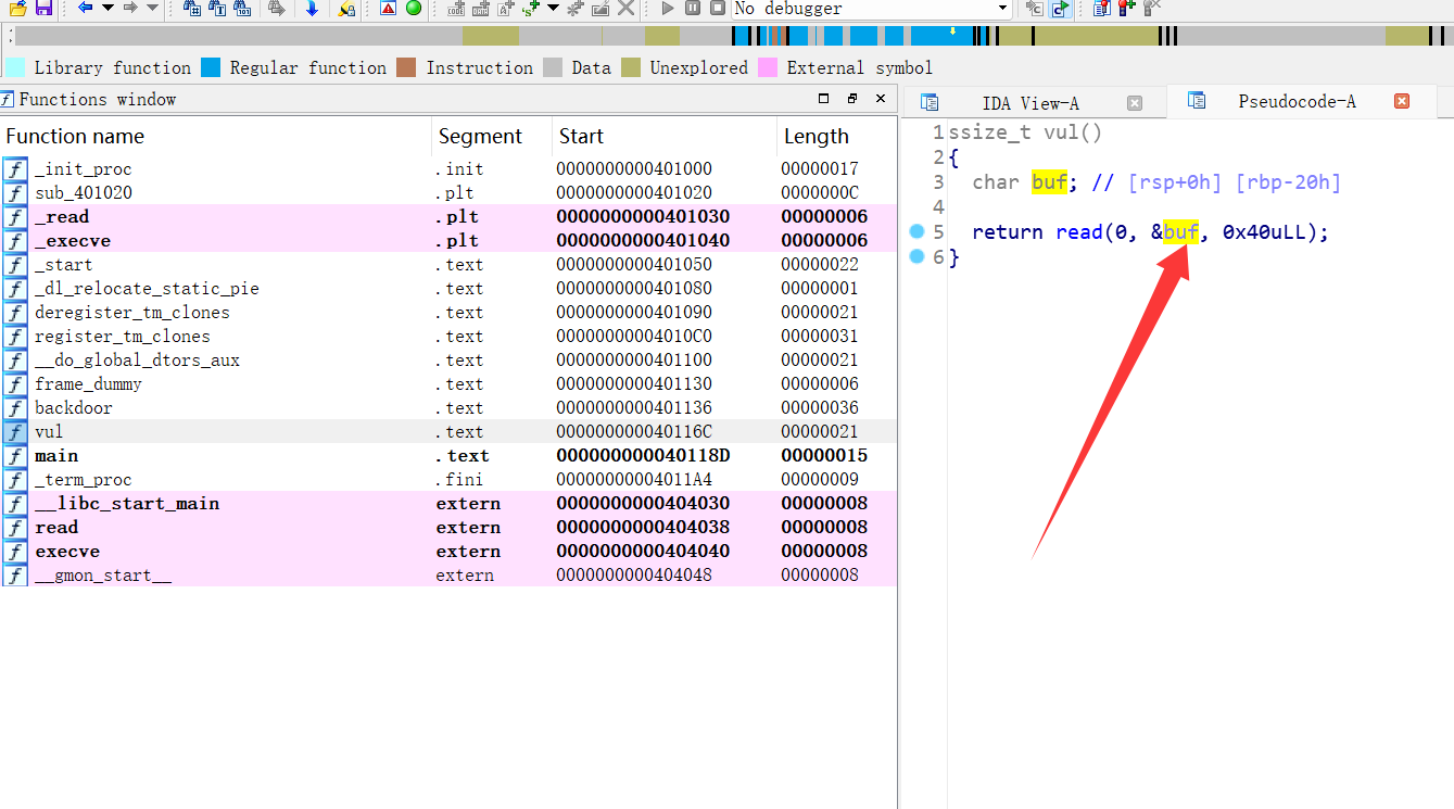 攻击目标很明显,就是要劫持程序控制流到源码中已定义的后门函数 backdoor()。backdoor() 函数执行 /bin/sh,vul() 函数包含一个 0x20 字节的 buf,但通过 read(0, buf, 0x40) 读取 0x40 字节的数据,存在缓冲区溢出漏洞,main() 函数调用 vul()。