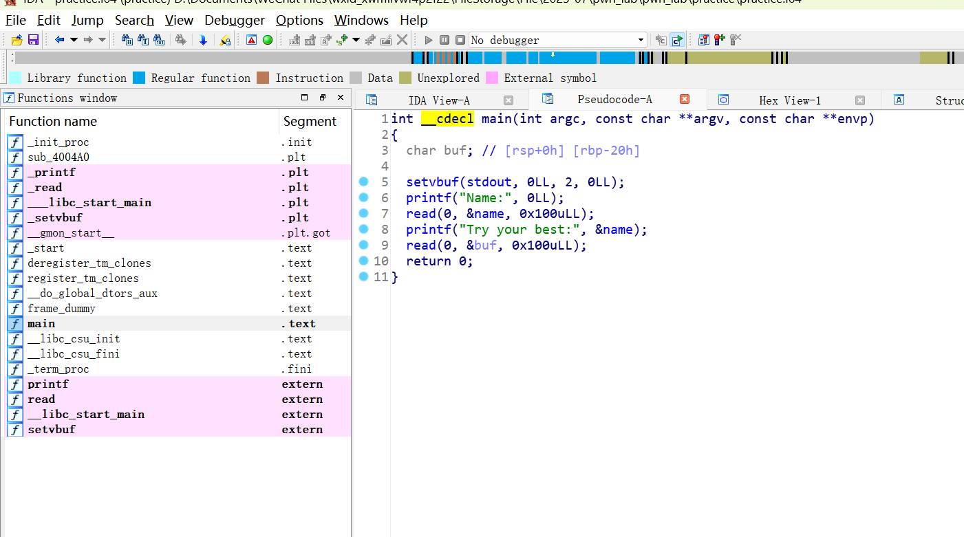 setvbuf(stdout, 0LL, 2, 0LL);:设置stdout为行缓冲,方便交互输出立即显示。printf("Name:", 0LL);:打印Name:提示用户输入。read(0, &name, 0x100uLL);:从标准输入读取最多256字节到name变量。printf("Try your best:", &name);:传入了&name作为格式字符串参数,而printf第一个参数是格式字符串。这里的&name其实指向用户控制的字符串,导致格式字符串漏洞(format string vulnerability)。read(0, &buf, 0x100uLL);:继续读取256字节到buf,buf只有一个字节大小,造成缓冲区溢出漏洞。