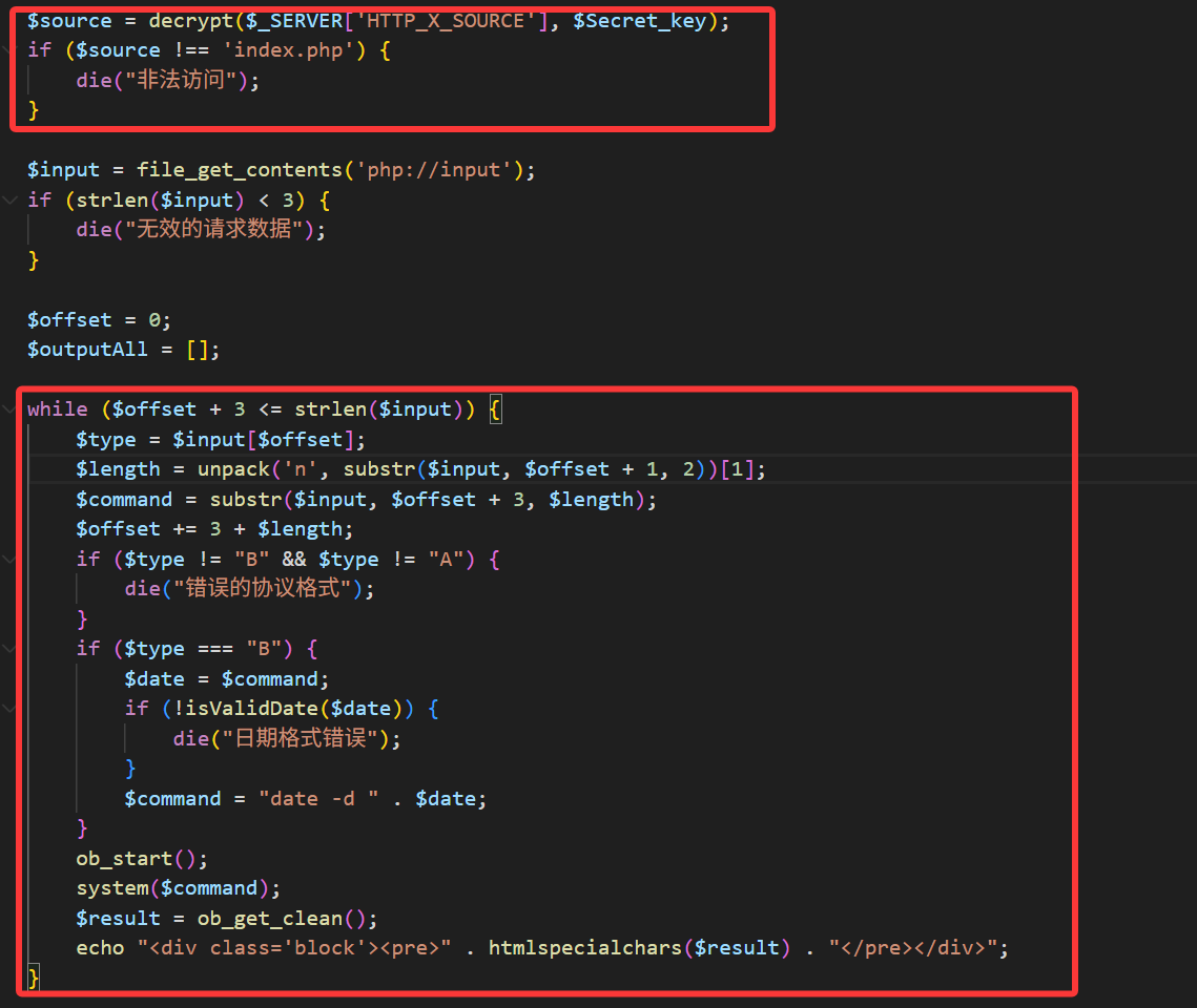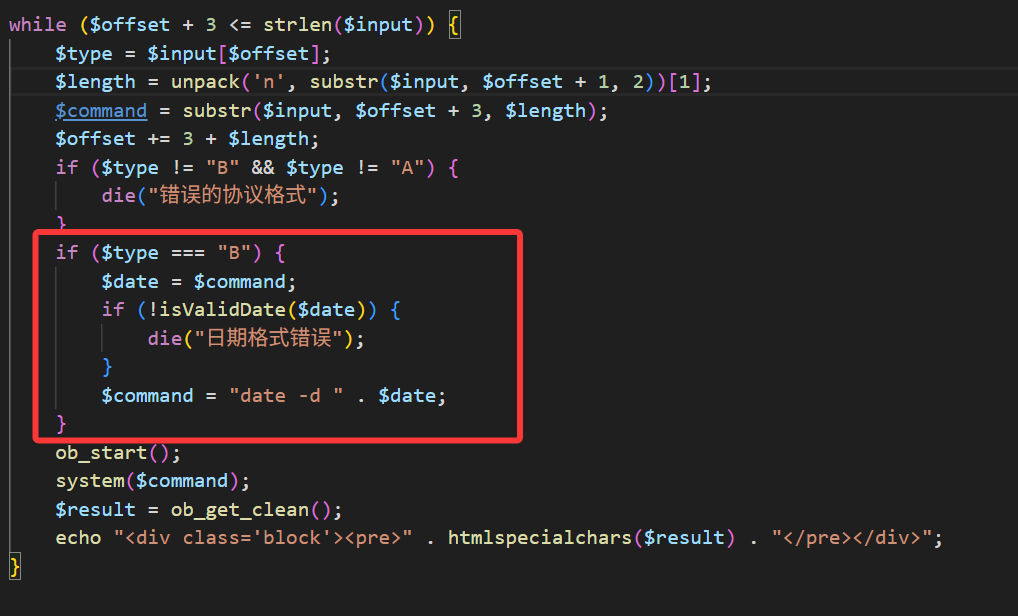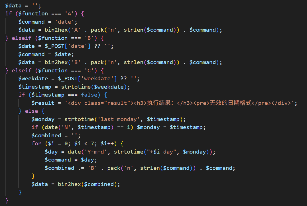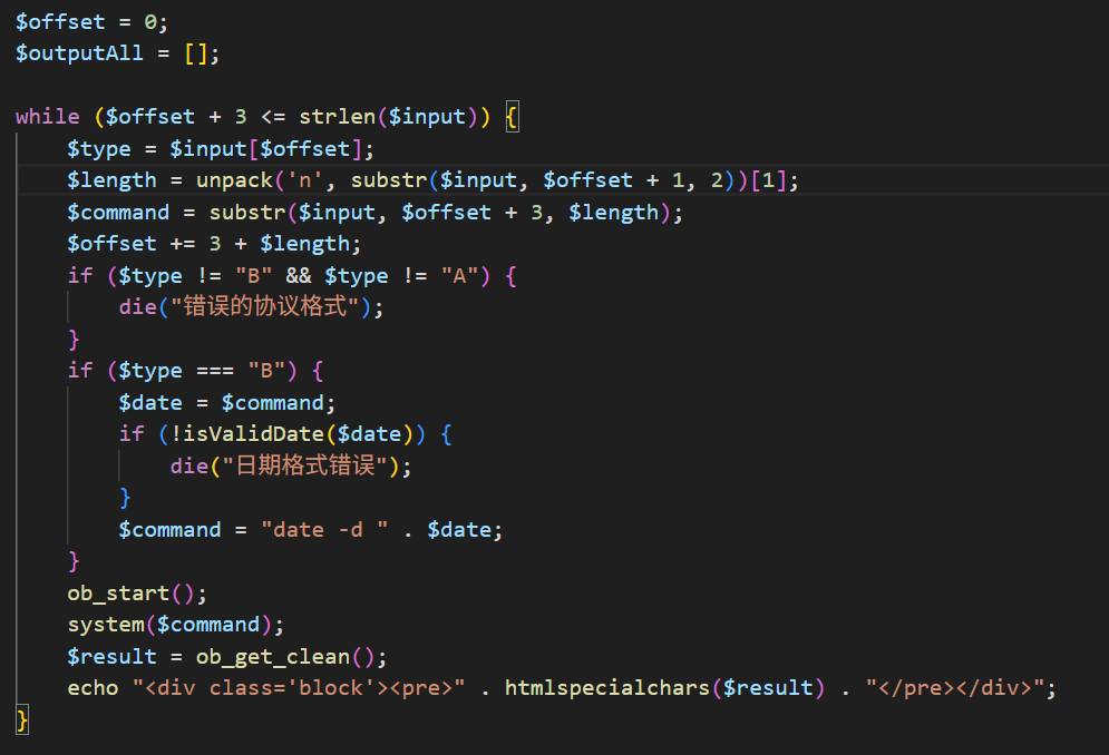 在execute.php中会首先判断来源是否是index.php,判断成功后对传入的二进制协议进行解析,若标志字段是A,直接执行命令,若标志字段是B,则会判断传入的命令是否是一个合法的日期格式,判断成功后拼接date -d进行执行,否则退出