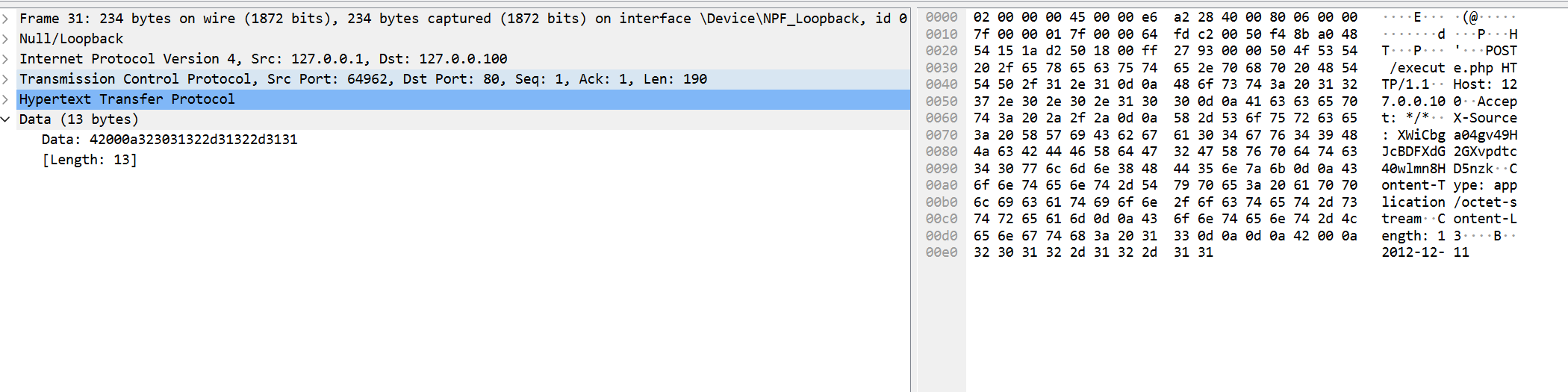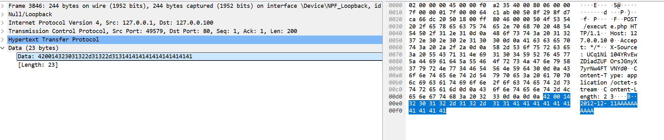 这里我们可以尝试恶意构造一个错误的数据,比如在2012-12-21后面加10个A,可以看到此时的长度就变成了0014,也就是20,这证明我们恶意构造一个比较长的数,这个长度字段确实会随之增长: