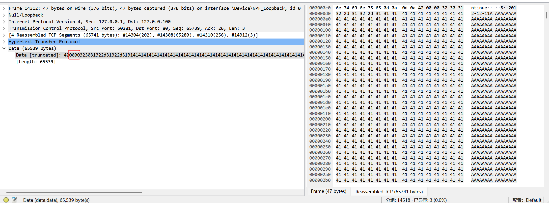 16位也就是我们之前看到的000a,而16位无符号整数其实有上限的,它的上限就是ffff,如果我们再给它加1,它就会变成10000,而经过16位的截断,实际上写入协议的长度就变成了0000。我们不妨做个实验,16位无符号整数的最大值是65536,而本来的载荷2012-12-11的长度是10,理论上我们只要再在2012-12-11的后面加65526个A,那么现在写入协议的长度字段就应该变成0000,而事实也正如我们所愿,它变成了0000: