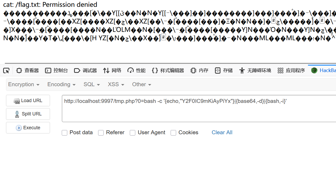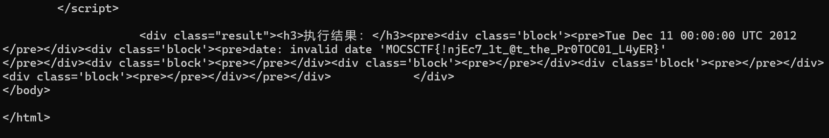 因此要想在页面上看到输出,我们需要把错误信息也输出到缓冲区,最后能打通的payload其实是date -f /f* 2>&1,不过再传POST的时候还需要对&特殊处理一下,否则解析会出错,比如我的exp.py里是直接base64了,最后我们终于可以读取flag了: