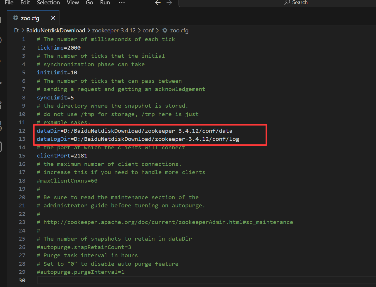 首先去下一份zookeeper,解压之后将conf目录下的zoo_sample.cfg文件,复制一份重命名为zoo.cfg,接着在zoo.cfg配置一下dataDir和dataLogDir路径(对应的日志目录需要自己创建一下)