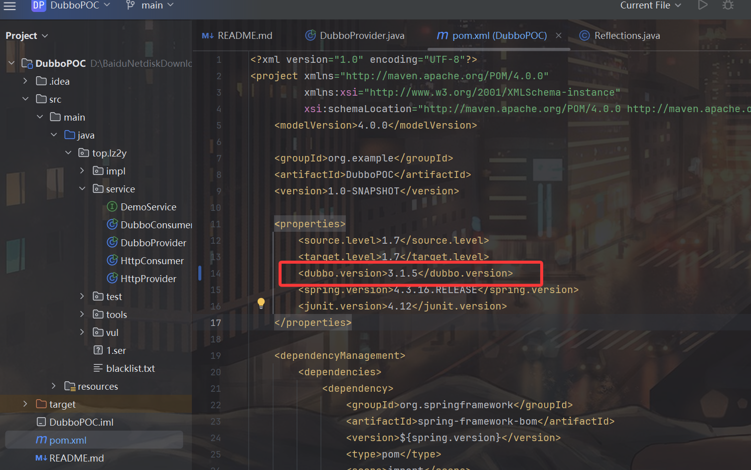 接着需要部署一下dubbo环境,这里我选择使用现成的项目:https://github.com/lz2y/DubboPOC,只不过这个项目默认对应的dubbo版本有点低,这里我改成 3.1.5 了,我本地的jdk环境是1.8_65: