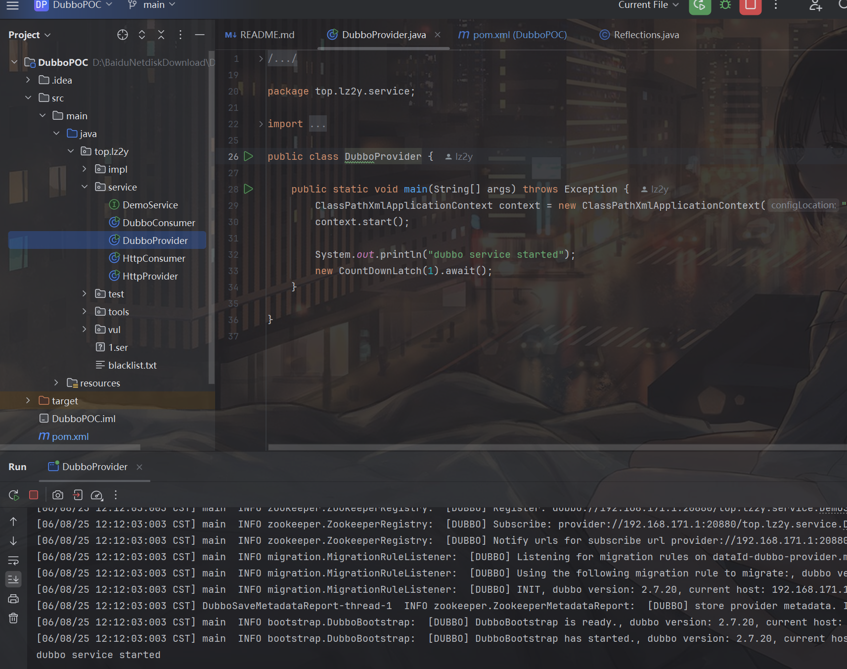 但是改完之后他这个环境因为之前的dubbo配置太老了,没办法直接运行 DubboProvider,我这里自己改了很多配置才搭起来,传到 github 上了,最后只需要启动一下 DubboProvider 即可,可以看到日志已经显示 dubbo service started: