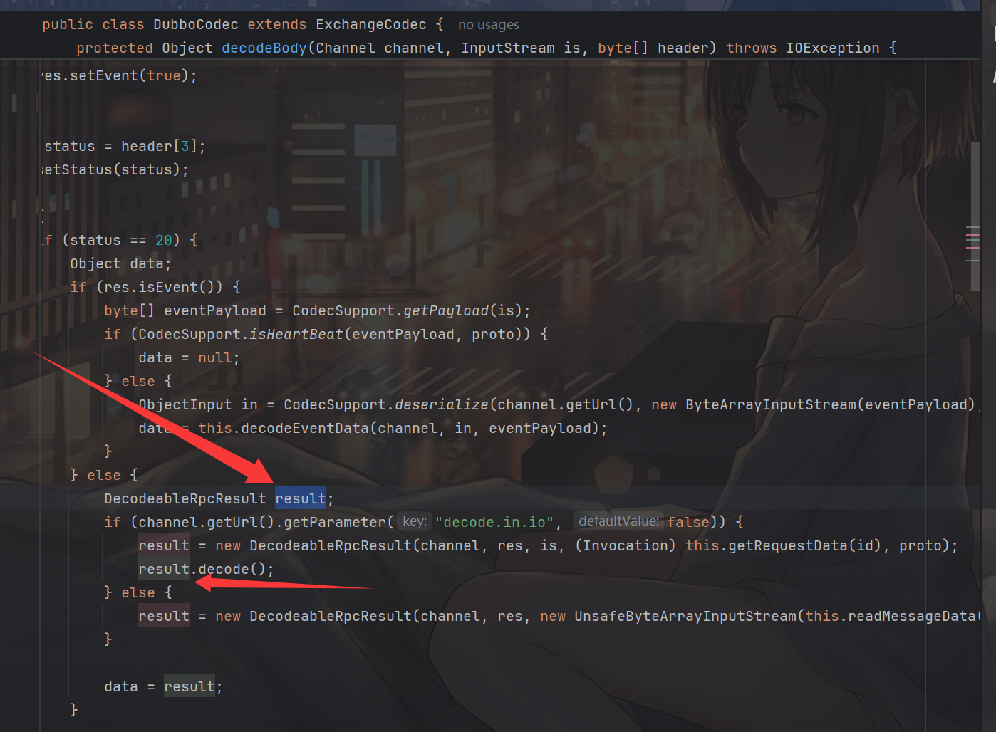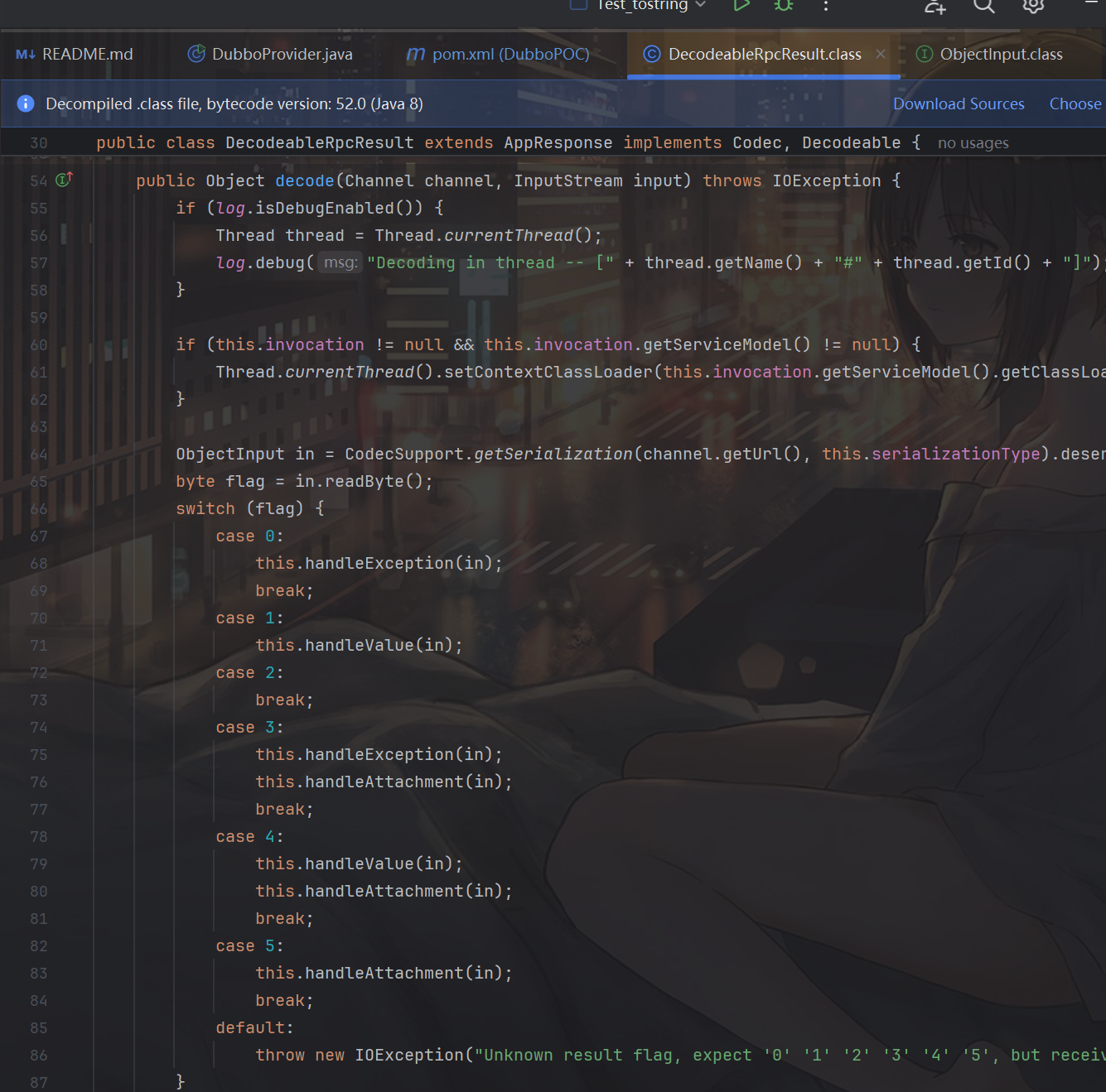 现在我们需要构造一个 Response 信息交给服务端解码,只不过服务端的解码逻辑好像和那个文章里提到的有点不一样,找了找是在 DubboCodec#decodeBody 具体执行的解码操作,可以看到这里它先定义了一个 DecodeableRpcResult 类型的 result,然后触发了 result.decode():