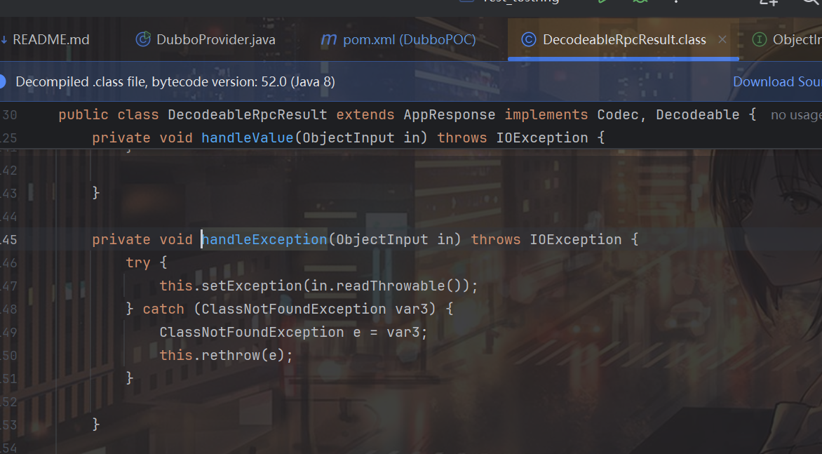 现在得想办法调用 DecodeableRpcResult#decode,在网上找到了一篇讲 Dubbo 的文章:Dubbo 编解码那些事_decodeablerpcresult-CSDN博客 ,这里提到消费者在接收响应时会使用 DecodeableRpcResult#decode 进行解码: