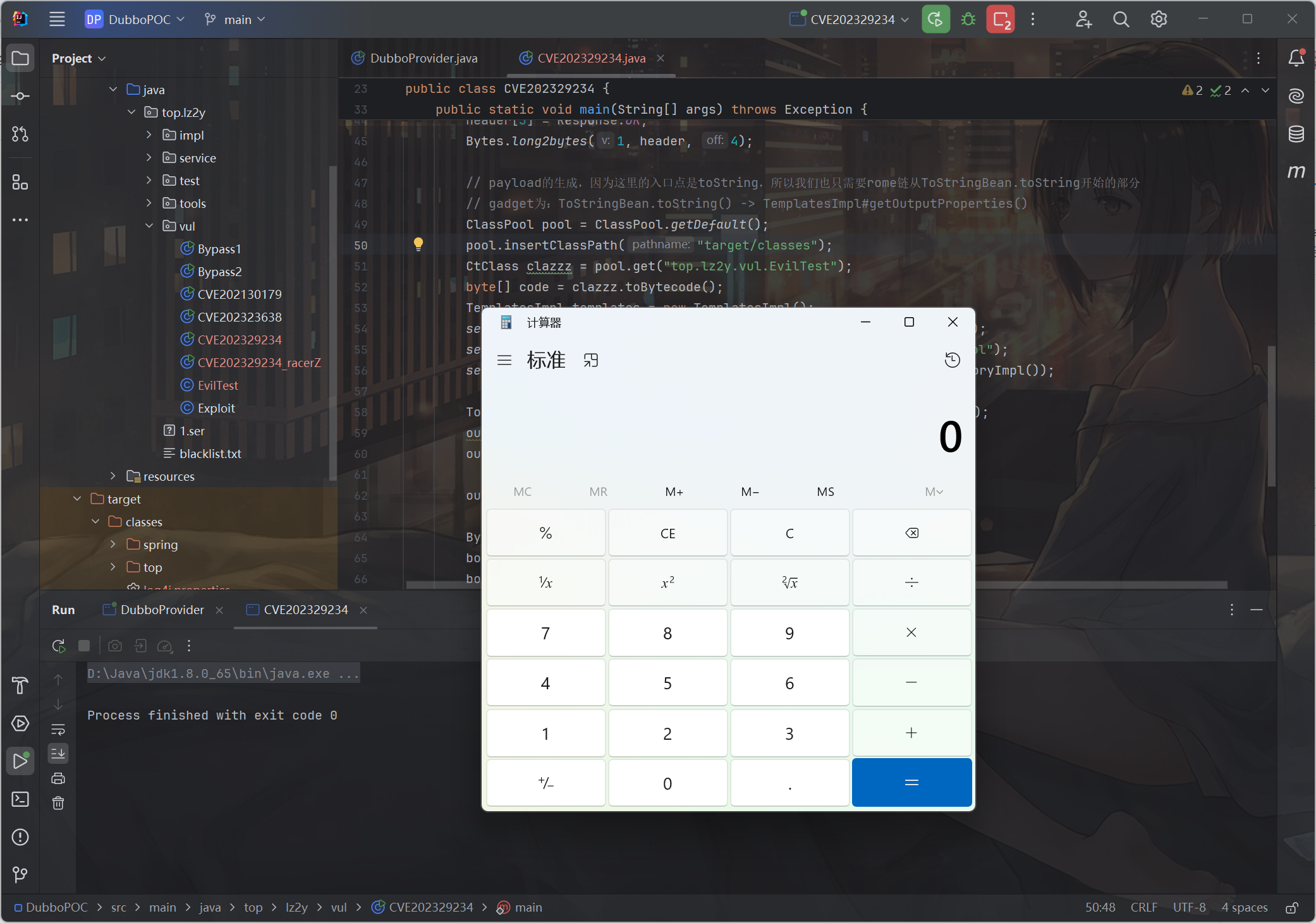 因为这里的入口点是toString,所以我们也只需要rome链从ToStringBean.toString开始的部分,gadget为:ToStringBean.toString() -> TemplatesImpl#getOutputProperties,完整代码如下(top.lz2y.vul.EvilTest是提前配好的类,主要就是弹了一下计算器):