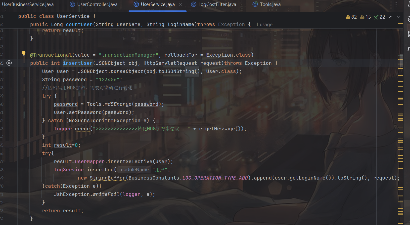 跟进insertUser,在 Service 层这里,当我们选择插入一个用户,他的密码会被初始化为123456然后转MD5: