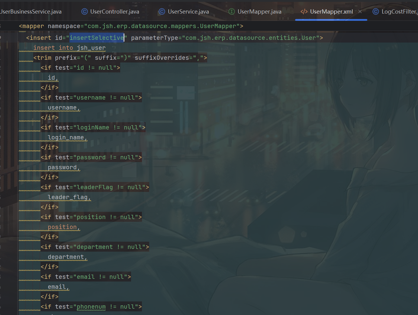 最后看到 MyBatis XML 映射层,MyBatis 框架根据 XML 配置生成动态 SQL 并执行 INSERT INTO jsh_user 的 SQL 语句,可以看到需要的参数有id、username、login_name 啥的: