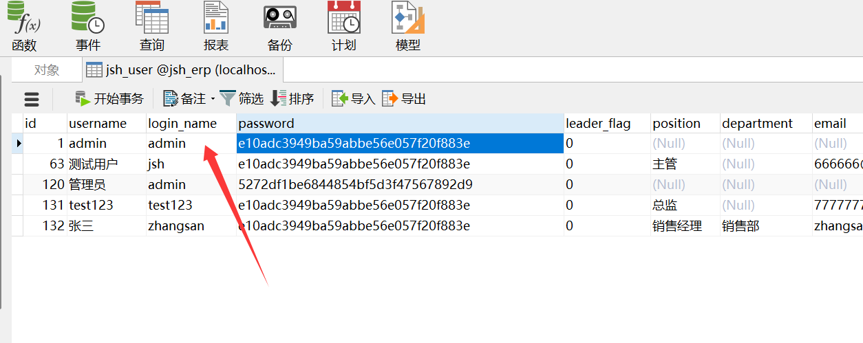 这里我们插入一个id为1、username和loginName都叫admin的新用户: