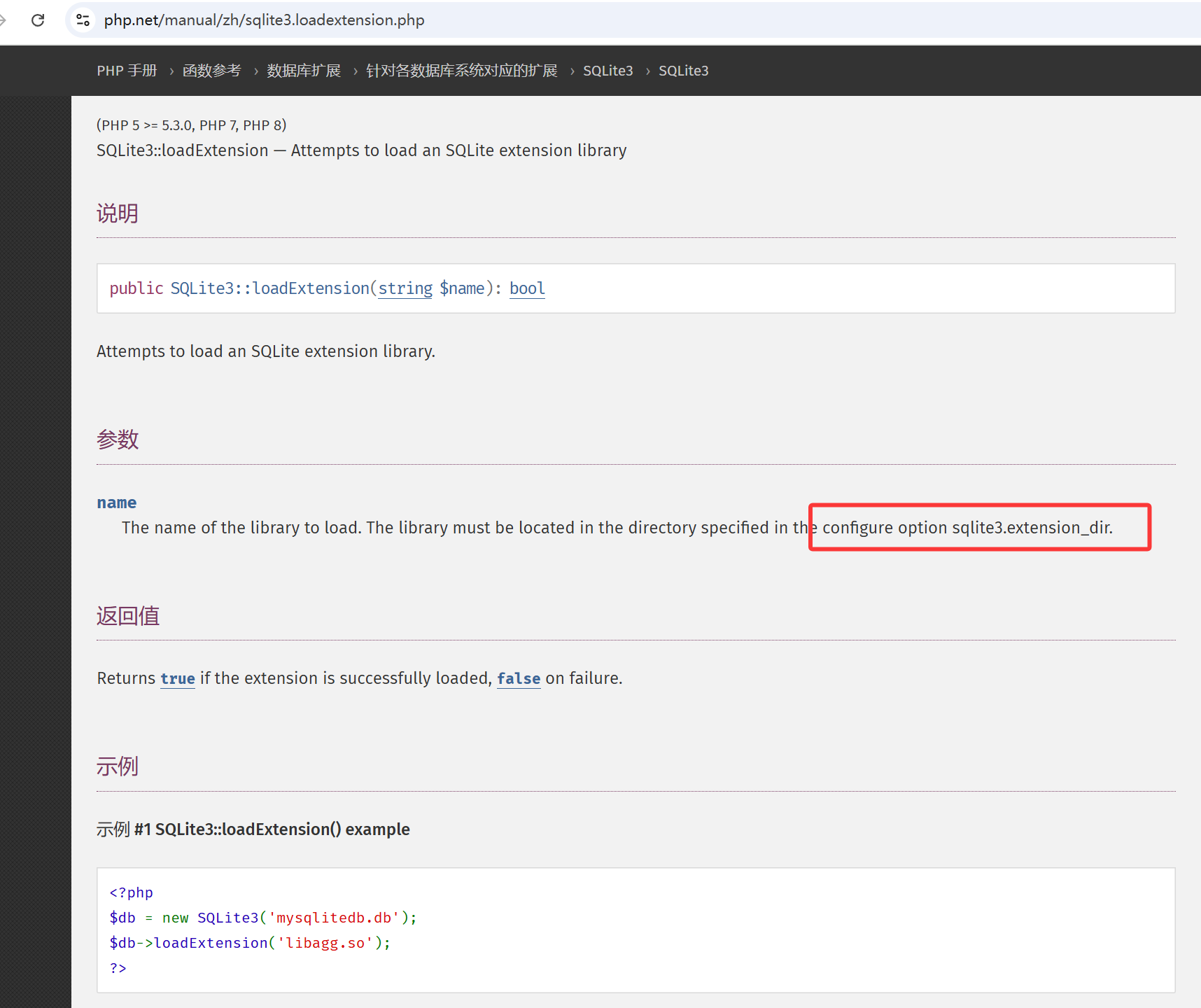 从官方文档可以看出来, SQLite3::loadExtension 可以加载so文件,但是这个方法限制了加载 so 的目录,不是一个我们的可控点:https://www.php.net/manual/zh/sqlite3.loadextension.php